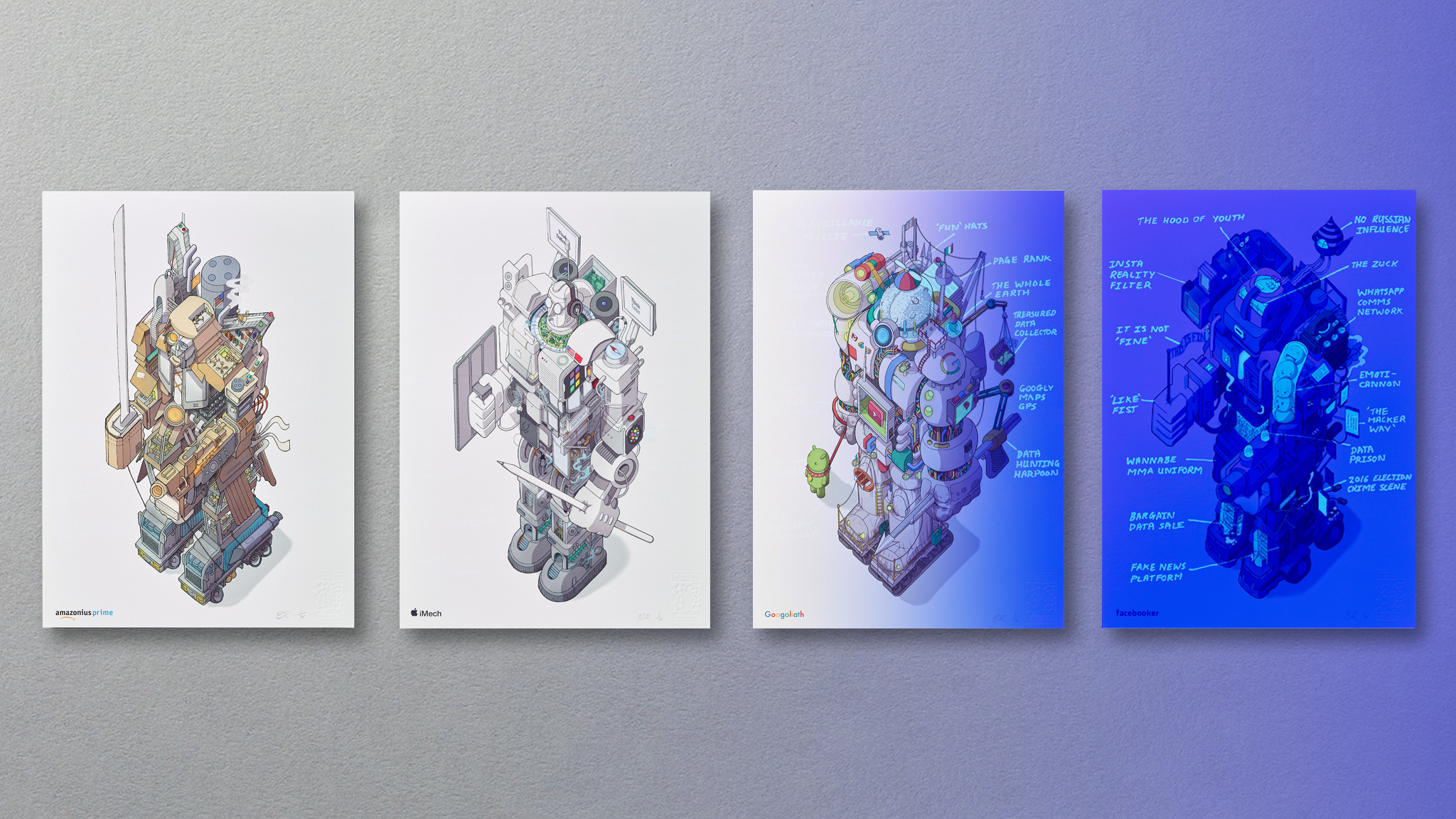 a collectable series of of limited edition A4 prints of big tech, as giant robots with a secret UV layer. signed, stamped, numbered and shipped with a mini blacklight. no reprints.